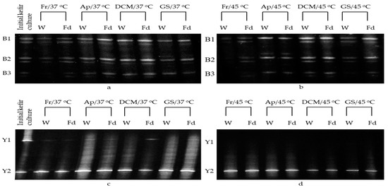 DGGE bacterial (a,b) and eukaryotic (c,d) fingerprint representing PCR-amplified 16S rRNA and 26S rRNA, respectively, from total community DNA derived from wet or freeze-dried free or immobilized kefir culture after semi-dry and sweet low alcohol wine-making at high temperatures (37 and 45 °C). For each sample, two replicate profiles from two independent nucleic acid extracts were analyzed and compared to free kefir culture (prior to use in fermentations). Fr: Free kefir culture, Ap: Immobilized kefir culture on apple pieces, DCM: Ιmmobilized kefir culture on DCM, GS: Ιmmobilized kefir culture on grape skins. W: Wet, Fd: Freeze-dried. The fermentation temperature is shown after the sample codes. Y1 band: Kluyveromyces marxianus/Kluyveromyces lactis, Y2 band: Saccharomyces cerevisiae, B1 band: Lactobacillus helveticus/Lactobacillus dextrinicus, B2/B3 band: Lactobacillus buchneri/Lactobacillus kefiri/Lactobacillus sunkii.