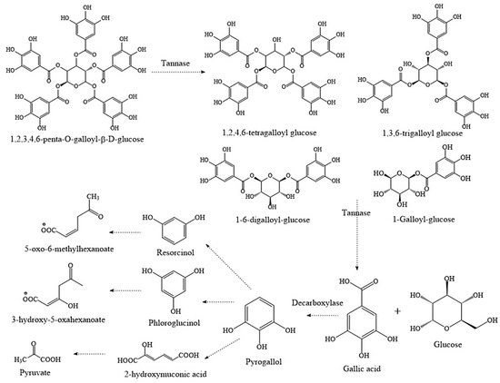 Biodegradation of tannins. Breakdown of gallotannins by tannase and other enzymes (original source).