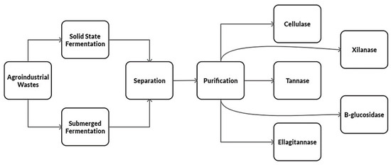 Agro-industrial wastes rich in polyphenolic compounds can be used as a source of carbon and energy so that the microorganism can develop and produce tannases. This section describes some research papers where they used agro-industrial waste to produce tannases with the help of microorganisms. For example, coffee pulp rich in polyphenolic compounds as a source of carbon and energy were evaluated through a solid-state fermentation process for tannase production. The authors concluded that the utilization of this wastes for tannase production has potential applications in the food industry [74]. In another study, solid-state fermentation was used for tannase production, using a medium containing pomegranate peels (10%) and other salts with pH adjusted to 7.0. These production conditions were compared to define the optimal ones, and various carbon sources, including Moringa cake, palm kernel, palm fronds, wheat straw, olive cake, and pomegranate peels were evaluated [75]. Tannase production from solid-state fermentation using coir waste as a substrate was performed. In the reactors, 10 g of the substrate were added and subsequently incubated at 30 °C for 48 h [76]. The tannase-biotransformed grape pomace extracts were evaluated to prove intestinal anti-inflammatory activity using an in vitro colon model. This research mentioned that the biotransformation improved the anti-inflammatory effect in Caco-2 cells, indicating that the application of a bioprocess in grape residues may contribute to the development of new ingredients and nutraceuticals with anti-inflammatory potential [77]. Various agricultural wastes (coffee husk, tamarind seed powder, bagasse, groundnut oil cake, wheat bran and rice bran) and solid substrates (bengal gram powder (Cicer arietinum), black gram flour (Vigna mungo L.), green gram flour (Phasleolus aureus), barley (Hordeum vulgare), millet flour (Peninsetum glaucum), ragi (Eleusine coracana), oats (Avena sativa), corn flour and rice flour) were evaluated to produce tannase by Lactiplantibacillus plantarum [78]. In another study, agro-industrial wastes were shown to be generally rich in tannins and can be used as low-cost substrates for tannase production. Agro-industrial wastes as potential substrates were evaluated for enhanced tannase production using solid-state fermentation. Rice bran showed the highest tannase activity during solid-state fermentation, followed by brewer’s rice, spent coffee grounds, and desiccated coconut waste [48]. The cost-effective substrate Triphala was used as a tannin and energy source for tannase production through solid-state fermentation. In this research, statistical experimental design with Triphala at optimized conditions showed 6.1-fold higher tannase activity than that obtained in submerged fermentation [43]. Tannase production was optimized using pomegranate husk as a solid substrate. Easily available and low-cost substrates such as cow dung, coffee husk, apple peel, and pomegranate peel were initially screened for tannase production [79]. On the other hand, a cocktail of hydrolytic enzymes was performed by solid-state fermentation using as substrate a mixture of grape pomace and wheat bran. They concluded that the use of solid-state fermentation is a less costly alternative to obtain an enzymatic cocktail that can be used in the food industry [80].