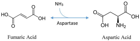 While several species of bacteria including select Pseudomonas, Bacillus, and Proteus have been identified as producers of aspartic acid, E. coli and Cornybacterium glutamacium are nearly exclusively used by industry [,]. Fumaric acid is the primary substrate in L-aspartic acid production; however, maleate, a less expensive feedstock, can be used in a two-step reaction which uses maleate isomerase to convert maleate to fumaric acid which is then converted via L-aspartase to L-aspartic acid in the presence of ammonium ions [].