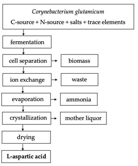 - Yukawa, H.; Ookino, S.; Inui, M. L-Aspartic Acid, Production Processes. In Encyclopedia of Industrial Biotechnology; Wiley: Hoboken, NJ, USA, 2010; pp. 1–3. [Google Scholar]