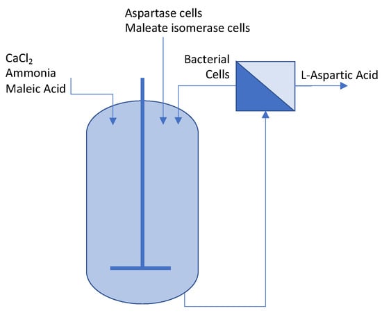 More recently, membrane reactor systems (MRS) are being developed, the use of growth-arrested cells eliminating the need for immobilization (Figure 3) []. The MRS system employed by Yukawa et al. (2009) overcomes the low mass transfer rates and low volumetric productivity issues associated with immobilization systems and simplifies the overall process, allowing for easier separation of cells from the reaction mixture and generating high yield and productivity during long periods of operation []. While industrial L-aspartic acid production began with immobilized enzymes or cells, it has progressed to include both fermentative and membrane reactor systems [].