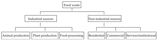 According to the project (“Food Use for Social Innovation by Optimizing Waste Prevention Strategies”) funded by the European Commission [22], the definition of food waste refers to “any food, and inedible parts of food, removed from the food supply chain to be recovered or disposed”. In this regards, food waste will be often generated from the retailers, consumers, and food service providers or food processing manufacturers due to the expiration, discard during the sorting operation, leftover, and other wastage reasons [23]. Figure 1 shows the categories of food waste based on its generation sources. In the present study, the industrial sources referred to the agricultural farms (e.g., s laughterhouse, hatchery, oyster farm, aquafarm, and truck farm), and animal-based or plant-based food processing plants or sites. By contrast, the non-industrial sources included the residential, commercial (e.g., office, retail, wholesale, warehouse and distribution, hotel, and restaurant), and service (e.g., hospital) and institutional (school) facilities [3].