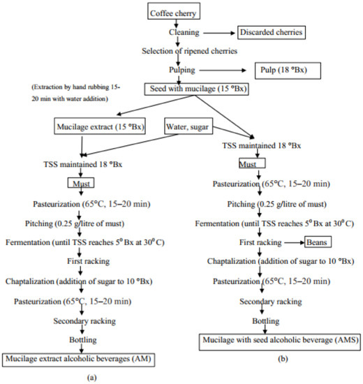 Coffee pulp, mucilage, and beans with mucilage were used to develop alcoholic beverages. The pulp of 45.3% pulp, 54.7% mucilage with seed, and 9.4% mucilage only were obtained during the wet processing of coffee. Musts were prepared for all to TSS (Total soluble solid) 18 °Bx and fermentation was carried out for 12–16 days until TSS decreased to 5 °Bx at 30 °C. Phenolic characteristics, chromatic structures, chemical parameters, and sensory characteristics were analyzed for the prepared alcoholic beverages. Methanol content, ester content, aldehyde, alcohol, total acidity, caffeine, polyphenols, flavonoids, chromatic structure, and hue of the alcoholic beverage from the pulp was 335 mg/L, 70.58 ppm, 9.15 ppm, 8.86 ABV%, 0.41%, 30.94 ppm, 845.7 mg GAE/g dry extract, 440.7 mg QE/g dry extract, 0.41, and 1.71, respectively. An alcoholic beverage from the pulp was found superior to an alcoholic beverage from mucilage with beans and a beverage from mucilage in sensory analysis. There is the possibility of developing fermented alcoholic beverages from coffee pulp and mucilage. However, further research is necessary for quality of the beans that were obtained from the fermentation with the mucilage.