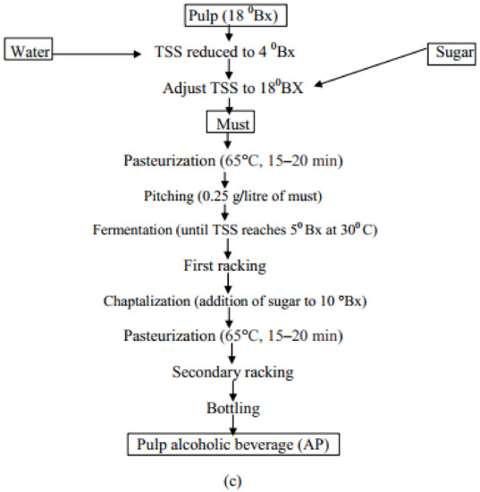 For fermentation, three types of preparations were done (Figure 1): (i) AP: The pulp with TSS (total soluble solids) 18 °Bx was kept in a fermenting glass. Only 3–4% juice was obtained. So, distilled water was added to cover all the pulp where TSS decreased to 4 °Bx. (ii) AMS: After pulping, the beans with the mucilage (TSS 15 °Bx) were collected in the clean and hygienic bucket. Distilled water at 20 °C was added to beans that were kept in fermenting glass jar. (iii) AM: Rapid rubbing by hand for 15–20 min was done to extract the mucilage (TSS 15 °Bx) from beans. For all three preparations, sterilization was done in a water bath at 65 °C for 15–20 min before maintaining the TSS. Distilled water was added to cover mucilage where TSS decreased to 9 °Bx. The TSS was raised to 18 °Bx for all musts before fermentation. The must (100 mL) was taken and heated to lukewarm temperature (35–40 °C). Wine yeast (Saccharomyces cerevisiae) at the rate of 0.25 g dry yeast/L of must was added. It was stirred until the effervescence of CO2 appeared. Then pitching was carried out. The musts were fermented in separate bottles fitted with air-locked corks until the TSS reached 5 °Bx. After the completion of fermentation, fermented juices for each sample were separated from the residues and table sugar was added to 10 °Bx for flavoring purposes. The beverages were allowed to settle for 2 days, siphoned through sterilized polyethylene pipes in clean sterilized bottles and pasteurized in a water bath at 65 °C for 15–20 min [21]. AP, AM, and AMS were aged at 4 °C for 15 days before analyses of chemical and sensory parameters.