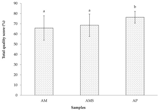 Total quality score for coffee-based alcoholic beverages. Error bars show standard deviation and error bars bearing different superscript differs (p < 0.05) with one-way ANOVA.