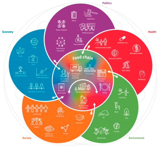 In association with food production, it is possible to highlight several significant negative externalities, ‘namely effects on the environment, the economy and the society that are not reflected in the cost of food’ [16]. These include the release of CO2 and other greenhouse gases, increase of wastes and pollution, contamination of freshwater, enhanced water deficiencies, soil depletion, a decrease of biological diversity, reduced benefits of microbiomes, the market of unsafe products, diffused antibiotic resistance, lessening of the supply for selected consumers groups, lastly whether the production is foster the rise of socioeconomic disparities [16,17,18,19,20]. Taken together, these undesirable trends threaten food security (Figure 2), human health, environmental resources, and economic networks, especially if we consider future generations.