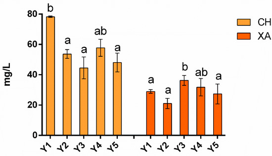 Total protein content base wines of Chardonnay (CH) and Xarel.lo (XA) elaborated with the addition of different S. cerevisiae (Y1, Y2, Y3) and non-Saccharomyces yeasts, M. pulcherrima (Y4) and T. delbrueckii (Y5). Different letters indicate significant differences between samples with different yeasts for each variety, Chardonnay (CH) and Xarel.lo (XA). Samples (n = 2).