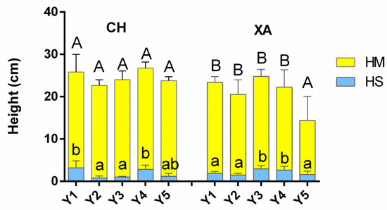 Foamability measurements of the different Chardonnay (CH) and Xarel.lo (XA) base wines made with different yeasts strains, Saccharomyces cerevisiae (Y1, Y2, Y3) and non-Saccharomyces, M. pulcherrima (Y4) and T. delbrueckii (Y5), using the Mosalux procedure. HM indicates the maximum height reached by the foam and HS the height in a steady state. Different letters indicate significant differences between samples with different yeasts. Uppercase letters for HM and lowercase letters for HS. Samples (n = 2).