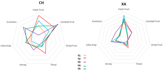 All of the base wines (BW) had glucose and fructose values below 0.5 mg/L, which indicated that they were completely dry base wines. In the case of CH wines, they showed a total acidity between 7.4 and 8.4 g/L. The amount of malic acid varied between 5.3 and 5.5 mg/L, and pH values were around 3.5 units. The base wines made from XA showed lower values than those of CH. The total acidity concentration ranged from 5.3 to 6.3 g/L, malic acid values from 1.2 to 1.6 mg/L, and pH from 3.1 to 3.2.