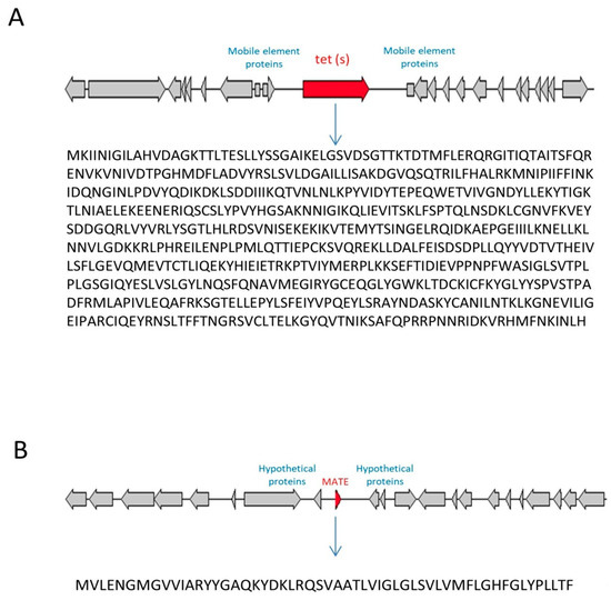 Genetic location of tet(S) (A) and conserved motif of MATE (multidrug and toxic compound extrusion) (B) genes analyzed on CARD and RAST servers, the respective amino acid sequences in S. thermophilus M17PTZA496.