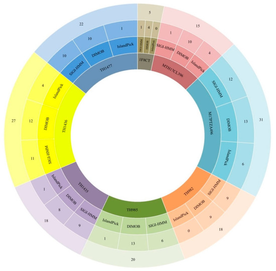 Distribution of genomic islands predicted by IslandPick, IslandPath-DIMOB, and SIGI-HMM on IslandViewer 4 server in the studied S. thermophilus strains.