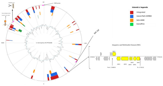 Among all the S. thermophilus genomes studied, the tetracycline-resistant strain M17PTZA496 displayed the largest number (31) of GIs with an overall size of 317.6 Kb, corresponding approximately to 16% of its genome size, including all clusters predicted by IslandPick, IslandPath-DIMOB, and SIGI-HMM and an intact prophage region (Figure 2).