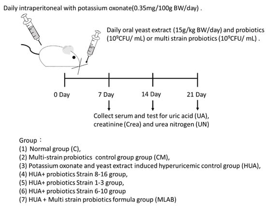 The animal experiment protocol approval number is HK-10805 (date: 5 July 2019) from HungKuang University, Taichung, Taiwan. The experimental animals included 56 30-day-old (about four weeks) male Wistar rats, which were purchased from BioLASCO Taiwan Co. Ltd. (Taipei, Taiwan). The temperature in the animal room was controlled at 23 ± 1 °C and the relative humidity at 40–60%. An automatic controller was used to create a 12/12 h light-dark cycle (light period: 8:00 to 20:00; dark period: 20:00 to 8:00). The animals were kept in individually ventilated cages (IVC) and given ad libitum access to feed and sterile distilled water. After one week of acclimatization, S-shaped cages were used for grouping, with eight rats per group. A total of seven groups were established to test the uric acid-lowering effects of LAB strains from different sources. These groups included a blank control (C), a multi-strain LAB blank control (CM), a hyperuricemia induction group (HUA), a hyperuricemia induction + strain (107) 8–16 treatment group, a hyperuricemia induction + strain (107) 1–3 treatment group, a hyperuricemia induction + strain (107) 6–10 treatment group and a hyperuricemia induction + multi-strain LAB treatment group (MLAB). Intraperitoneal injection of potassium oxonate (0.35 mg/100 g BW/day) and gavage with yeast extract (15 g/kg BW/day) were used to induce hyperuricemia in the rats (Figure 1).