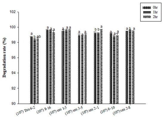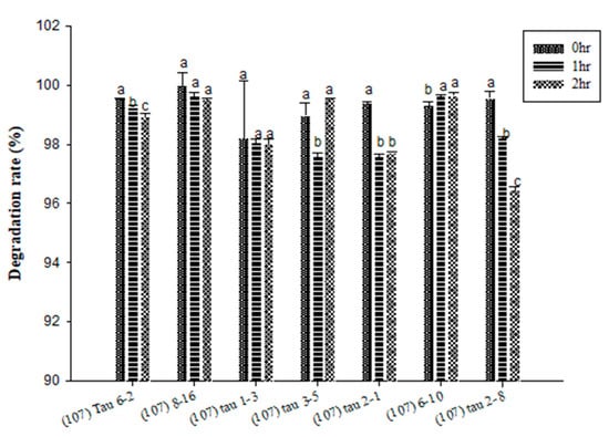 Figure 2 showed the inosine degradation experiment results for the LAB strains. At all time points, the inosine degradation rates of all strains were 95% or higher. The preferred strains were (107) 8–16 and (107) 6–10. Both strains maintained stable degradation rates of 99% across all time points. The next best strains were (107) tau 1–3 and (107) tau 3–5. Although (107) tau 1–3 had a degradation rate lower than that of the preferred strains, it reached 95% and above and showed an increasing trend. On the other hand, (107) tau 3–5showed a reduction to 97% at 1 h but then rose to 99% at 2 h. Therefore, both strains were retained as candidates. The analysis of guanosine degradation by LAB found that the guanosine degradation rates of all tested strains reached 95% or higher (Figure 3). The preferred strain was (107) tau 1–3, with a degradation rate reaching 99.5% and a stable increase. The second was (107) tau 2–8, with an overall stable degradation rate of 99.5%. In third place were (107) 8–16 and (107) tau 2–1. Although the rate of (107) 8–16 dropped to 99.36% at 2 h, the overall degradation rate was high. There was a stable degradation rate in (107) tau 2–1 at 0 and 1 h, which increased at 2 h (Figure 3). The guanosine degradation rates of the (107) 6–10 strains were 99.2, 98.8 and 98.9% at different time point (Figure 3). In summary, the HPLC analysis of inosine degradation tested strains (107) 8–16, (107) 6–10, (107) tau 1–3 and (107) tau 3–5, while the analysis of guanosine degradation tested strains (107) tau 1–3, (107) tau 2–8, (107) 8–16 and (107) tau 2–1.
