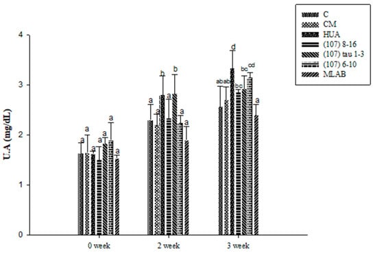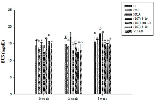 The BUN results in the experimental animals are shown in Figure 6. There were no significant differences among the different groups at week 0 (p > 0.05). At week 2, the BUN concentration in the HUA group was 13.64% higher than that in the C group (p < 0.05). After induction and feeding with LAB strains from different sources, the serum BUN concentrations in the treatment groups, including strains (107) 8–16, (107) tau 1–3, (107) 6–10, and MLAB, were significantly lower than those in the HUA group (p < 0.05) by 22.42%, 19.07%, 27.27% and 23.12%, respectively. Among these groups, BUN reduction was the greatest in the 6–10 group, while there was no significant difference observed between the CM and C groups (p > 0.05). At week 3, the BUN concentration in the HUA group was 13.19% higher than that in the C group (p < 0.05). After induction and feeding with LAB strains from different sources, the serum BUN concentrations in the treatment groups including strains (107) 8–16, (107) tau 1–3, (107) 6–10, and MLAB, were significantly lower than those in the HUA group (p < 0.05) by 11.1%, 17.02%, 19.63%, and 16.11%, respectively. Among these groups, BUN reduction was the greatest in the 6–10 group, while there was no significant difference observed between the CM and C groups (p > 0.05). The results showed that strains 6–10 could prevent and decrease BUN in hyperuricemia induced by potassium oxonate and yeast extract.