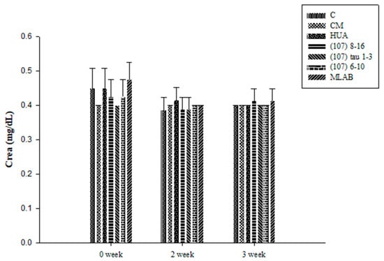Figure 7 shows the blood creatinine results for the experimental animals. There were no significant differences observed between the groups at week 0 (p > 0.05). At weeks 2 and 3, there were no significant differences found between groups after induction and feeding with LAB strains from different sources (p > 0.05). The results showed that hyperuricemia induced by potassium oxonate and yeast extract did not affect serum creatinine and that probiotics from different sources did not affect the creatinine concentration.