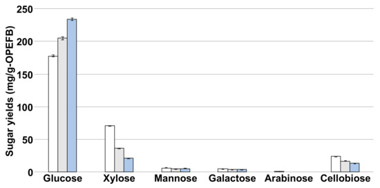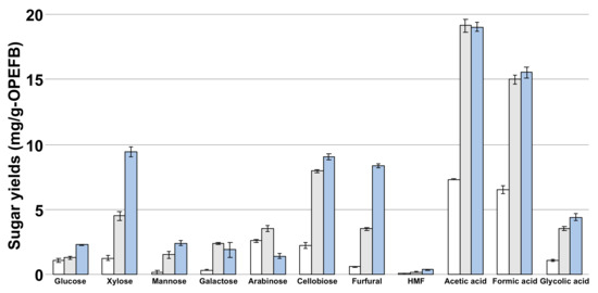We have previously prepared the hydrolysates from eucalyptus [19], OPFF [20], and OPMF [24], respectively. To confirm the usefulness of the hydrolysate preparation method developed in this study, we compared the sugar yield with that reported in the previous study (Table 3).