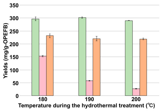 Effect of hydrothermal pretreatment temperature on cellulose, hemicellulose, and lignin yields. Cellulose, hemicellulose, and lignin yields are indicated in green, pink, and orange bars, respectively.