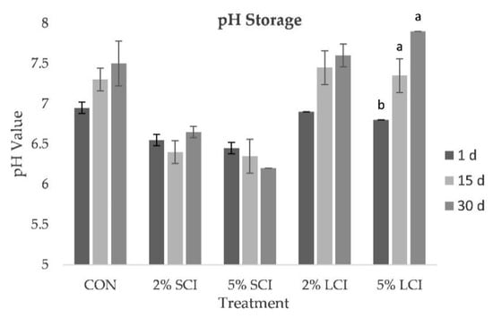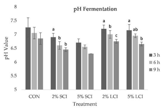 pH values of the five almond beverage treatments taken at 3, 6, and 9 h of fermentation. CON, control; SCI, short chain inulin; LCI, long-chain inulin). Means with different letters in the same group indicate significant differences between measurement times (p < 0.05).
