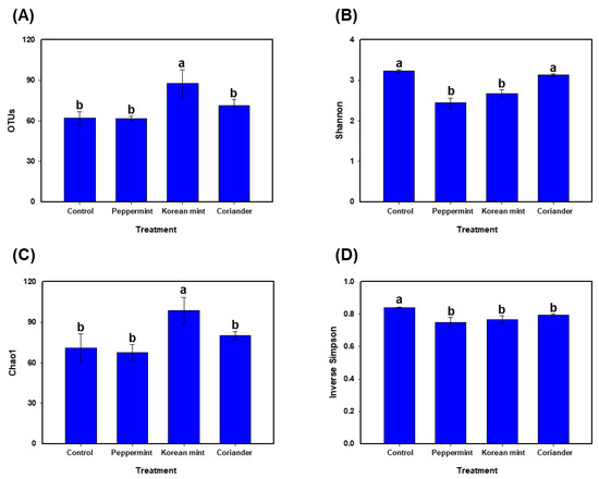 Alpha diversity in the soy paste samples prepared by adding Peppermint, Korean mint, and Coriander, relative to that in control. (A) Number of operational taxonomic units (OTUs), (B) Shannon diversity index, (C) Chao1 richness index, and (D) Inverse Simpson’s index. Data are represented as the means ± standard deviations in triplicate. Different letters on the error bars represent significant differences at p < 0.05.