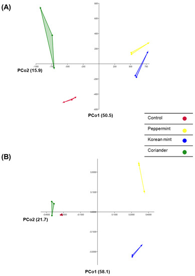 Principal Component Analysis (PCA) of (A) Euclidian and (B) Bray–Curtis distances of soy paste samples prepared by adding Peppermint, Korean mint, and Coriander, relative to those of the control. Each dot represents a replicate of the different groups of doenjang samples.