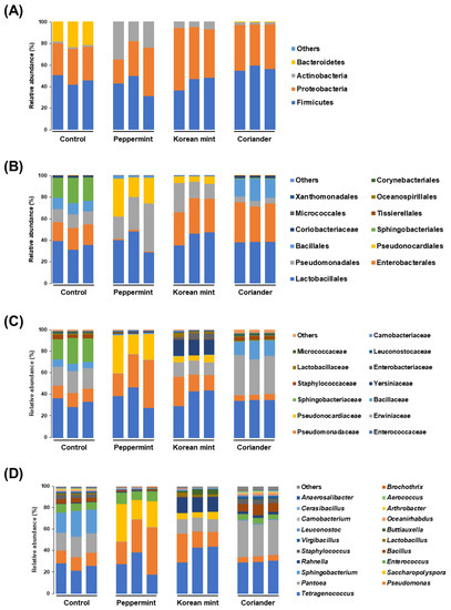 Stacked bar graphs representing the microbiome structure in soy paste samples prepared by adding Peppermint, Korean mint, and Coriander, relative to that of the control. (A) Phylum level, (B) order level, (C) family level, and (D) genus level.