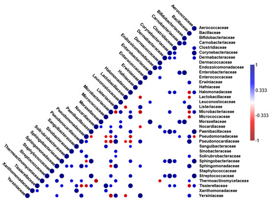 Different significantly (p < 0.05) positive and negative correlations between the OTU counts corresponding to different bacterial families in all the tested doenjang samples (n = 12) were determined based on the Pearson’s coefficient matrix. The strong positive and negative correlations indicated by the large blue and red circles (Figure 5) suggest the possible coexistence or antagonism between the different bacterial families. With respect to the doenjang fermentation microbiota, significant negative correlations between the Bacillaceae and Halomonadaceae, and the Lactobacillaceae, Microbacteriaceae, Micrococcaceae, and Tissierellaceae families were observed (Figure 5).