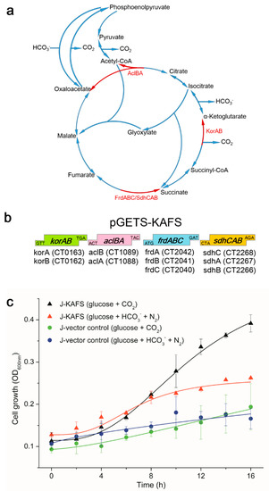 Designed genetic pathway and growth of transgenic E. coli strains with different inorganic carbon sources. (a) Pathway map of CO2 assimilation enzymes related to this study. The heterologously expressed enzymes are marked in red. AclBA, ATP-dependent citrate lyase; KorAB, α-ketoglutarate:ferredoxin oxidoreductase; FrdABC/SdhCAB, fumarate reductase. Blue arrows represent TCA cycle activities contributed by E. coli genes; arrowheads indicate oxidative (clockwise) or reductive (counter-clockwise) activities; blue/red activity lines are oxidative direction only for E. coli enzymes or reversible for cloned C. tepidum enzymes. (b) DNA cassettes used to construct the expression plasmid pGETS-KAFS, which encodes the korAB, aclBA, frdABC, and sdhCAB genes from C. tepidum. (c) Anaerobic growth curves of transgenic E. coli strains with CO2 or bicarbonate present in glucose culture medium. Data are expressed as the means ± standard deviations, n = 3 independent biological samples.