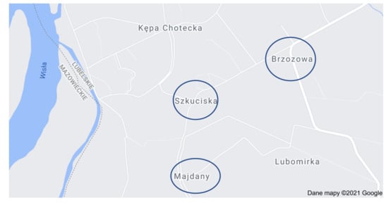 The research was carried out within the limits of the Małopolska Gorge of the Vistula. It is the largest hop-growing region in Poland. The region of the Małopolski Poland Vistula Gorge is about 80 km long and is located between Annopol and Puławy (Figure 5). The width of this area is 1.5–10 km, which gives a total area of about 300 km2 [].
