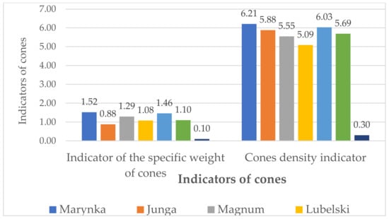 The highest index of specific weight of cones was obtained by the ‘Marynka’ variety, the ‘Sybilla’ variety had the highest cone compactness index.