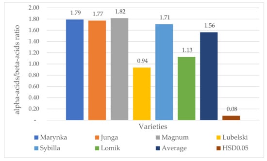 According to Eyres and Dufour [] the amount of essential oil and the proportions of individual fractions differ in different hop varieties. For example, the amount and composition of oxides, epoxides, and alcohols in the sesquiterpenes fraction varies widely between hop varieties. Resins and essential oils, as secondary metabolites, are the main ingredients in hop brewing. They are synthesized and accumulate in the lupulin glands found in the cones produced by female plants (H. lupulus L.). Some of the soft resins are hop acids. Composed of two chemically similar groups of compounds, such as alpha acids or humulones and beta acids or lupulones, they are mainly used in the beer brewing process and have both preservative and bitter properties. Alpha acids also contribute to microbial stability and enhance foam stability [,]. MacKinnon et al. [] proved that the development of alpha-acids in hop cones takes place from the beginning of cone formation. The development of two weeks earlier, however, is of key importance for the harvest of hop cones, because 90% of alpha acids are formed during this time [,,]. Compounds from the group of resins, especially alpha, are of the greatest importance in beer production. Alpha-acids give the beer a characteristic, bitter taste [,]. The chemical composition of hop cones was varied. The content of alpha acids was depending on the genotype. The varieties ‘Magnus’ and ‘Iunga’ stood out with the highest proportion of alpha acids.