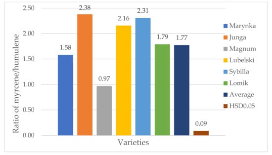 In the essential oils of the studied hop varieties, compounds with myrcene and α-humulene dominating the profiles were identified. The varieties ‘Iunga’, ‘Sybilla’ and ‘Lubelski’ were rich in monoterpene hydrocarbons, mainly myrcene, while sesquiterpenes hydrocarbons, mainly α-humulene, were more abundant in the ‘Marynka’ variety. The ‘Magnum’ variety was characterized by an even distribution of monoterpenes and sesquiterpenes. The ‘Lomik’ variety obtained the result at the level of the average for the varieties.