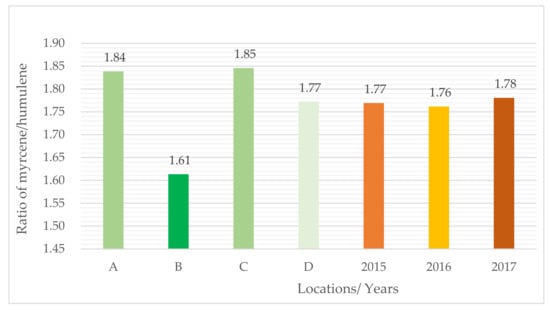 Chemical analysis is the most objective evaluation of hops from a technological point of view. There are three groups of compounds that go into solution during the boiling of the wort. These are: bitter substances (nourishing substances), which, depending on the variety, accounted for 15–25% of the DM of cones, tannins (2–65) and essential oils (0.5–2.5%). Hops essential oils are most commonly used in the brewing of beer, but can also be found in pharmacological products. Volatile aroma compounds of hops are of key importance for brewers, as they give the beer a unique hop aroma []. Hops oils are one of the most complex essential oils among the known and cultivated plants [,]. About 200 studies on the composition of hop oil have been published so far. The number of identified volatile compounds in hop oils continues to grow. Holt et al. [] and Dietz et al. [] believe that over 1000 volatile compounds are present in hops oil. However, it is still unclear which of the volatile components in the hops are directly transferred to the beer without undergoing biochemical changes such as esterification or enzymatic cleavage. Volatile components of hops are a very heterogeneous and complex mixture of hundreds of compounds in a certain concentration range, but their influence on the beer aroma is not directly proportional to their concentrations []. The presence and concentration of hop compounds is influenced by many factors, such as variety, location, geographic location, and conditions of plant growth and development [,,,]. In the conducted research, the chemical composition was analyzed, and the composition of essential oils and the alpha-acid content of 6 varieties of hops grown in 4 different locations were verified. The dried hop cones contained 0.7 to 2.6% of hop oil containing aromas and flavors belonging to several chemical classes, such as terpenes, alcohols, esters, aldehydes, and ketones. Both the amount and composition of hops oil are largely dependent on genetic factors, age of the hops or rootstock, growth conditions including soil, pH, carbon, nitrogen and moisture content, microbial weight, etc., but also on climatic conditions (temperature, humidity, sunshine, wind speed and direction) and from time from harvest [,].