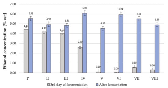 We investigated fermentation with various yeast strains. Figure 1 presents the ethanol concentrations obtained on the third day of fermentation and at the end of the fermentation process. The tested strains showed various fermentation activities. Much better dynamics of ethanol production were noted for the Crabtree-positive S. cerevisiae strains (I, II, III). The Crabtree-negative, non-Saccharomyces yeasts (V, VI, VII, VIII) fermented much more slowly. The amount of ethanol produced ranged from 4.52% v/v for K. marxianus (V) to 6.08% v/v for Saccharomyces cerevisiae Lalvin (IV). The most active strains (I, II, III) finished fermentation after 3–5 days, and the weak fermentative strains finished fermentation after 2–8 weeks (Table 5).