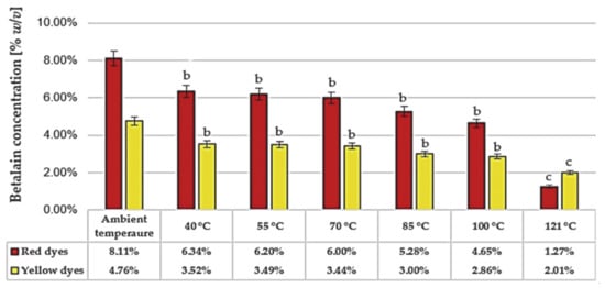 Stability tests for betalain dyes were performed across a wide range of temperatures (40–121 °C). Betalain pigments were assayed by differential spectrophotometry following the Nilsson method []. The samples were diluted with a phosphate buffer (pH 6.5), and the contents of betacyanins (red pigments) and betaxanthins (yellowish pigments) were determined at 476, 538, and 600 nm using a Spectroquant® Prove 300 spectrophotometer (Merck, Darmstadt, Germany) [].