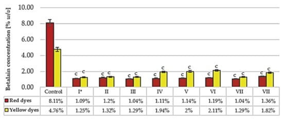 Betalain content after sterilization (121 °C) and fermentation with selected yeast strains. * Symbols: I, II, III, IV, V, VI, VII, VIII—as in Table 1. The control sample was the raw red beet juice before sterilization and fermentation. The results were compared to the control sample. Values with different letters presented in the figures show statistically significant differences: a, p ≥ 0.05; b, 0.005 < p < 0.05; c, p < 0.005.