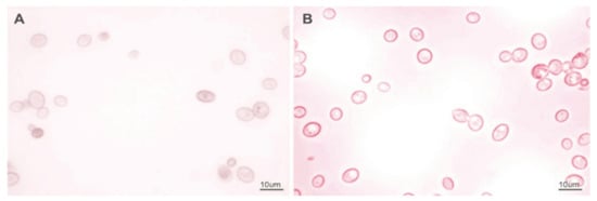 The total betalain contents after the fermentation trials varied from 2.34% to 3.29%, and decreased significantly in comparison to the control sample. The loss of the betalain fractions ranged from 75 to 82%. The desired proportion of betacyanins and betaxanthins (about 2) was not maintained []. We suppose that the main reason for this change was the sterilization process. The effects of incubation at various temperatures were shown in Figure 2. Yeast fermentation did not improve this negative effect. Similar results have been obtained in other studies after boiling and spontaneous juice fermentation, which resulted in high levels of betalain degradation (61–88%) []. The loss of betalains in the fermentation samples also may be due in part to the adsorption of dyes on the yeast cell wall. It is well known that yeast cells have the ability to adsorb various phytochemicals [,]. The absorption of the red pigment on the yeast cell wall was also confirmed microscopically, with the cells after fermentation having a distinct violet-red outline (Figure 4A,B).