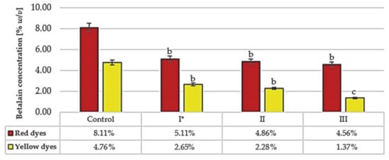 Betalain content in raw beet juice after fermentation with selected yeast strains (I, II, III). * Symbols of yeast strains: I, II, III—as in Table 1. The control sample was the raw red beet juice before fermentation. The results were compared to the control sample. Values with different letters presented in the figures show statistically significant differences: a, p ≥ 0.05; b, 0.005 < p < 0.05; c, p < 0.005.