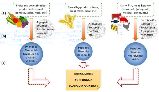 Flow-chart for antioxidants, antifungals, and exopolysaccharides from food by-products sources using fermentation: (a) categories of food by-products; (b) major microbes involved in fermentation; (c) fermentative microbial metabolites acting as antifungals or antioxidants.