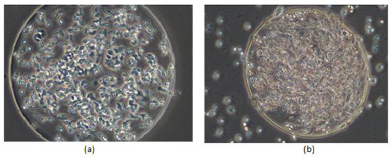 Optical microscopy images at 400× magnification of ND1 strain after microencapsulation treatment in alginate (a) and during the fermentation process (b).