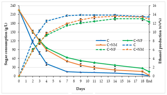 Kinetics of sugar consumption (solid lines) and ethanol production (dashed lines) in the three fermentation conditions. C—control fermentation, inoculated with EC1118; C + NF—mixed starter EC1118 + ND1 as free cells; C + NM—mixed starter EC1118 + ND1 as microencapsulated cells; End—last fermentation day, variable for each starter. Data are the means of triplicate experiments ± standard deviation.