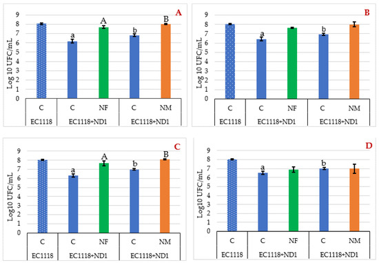 After three days of fermentation (Figure 3B), the number of S. cerevisiae viable cells remains similar to the first isolation for the control fermentation (C). In mixed fermentations, the number of ND1 viable cells was similar to the levels found after 48 h both in C + NM (1.12 × 108 CFU/mL) and C + NF (4.43 × 107 CFU/mL) trials, whereas the number of S. cerevisiae cells increased in both the mixed fermentations. However, the number of EC1118 cells was significantly higher in the fermentation inoculated with ND1 microencapsulated cells (9.18 × 106 CFU/mL) than in the trial inoculated with free cells of H. osmophila (3 × 106 CFU/mL). A similar trend was also observed after 4 fermentation days (Figure 3C).