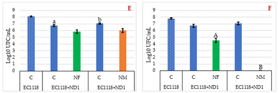 Yeast cell count detected at different times: (A) 2 days; (B) 3 days; (C) 4 days; (D) 7 days; (E) 9 days; (F) 11 days of fermentations inoculated with S. cerevisiae EC1118 in mixed culture with H. osmophila ND1 strain as free (NF) and microencapsulated (NM) cells. As control, pure fermentation with EC1118 was used (C). Data are the means of triplicate experiments ± standard deviation. Letters on plot bars indicate significant differences (p < 0.05) in cell count within EC1118 (a, b) and ND1 (A, B) in the two mixed starter fermentations.