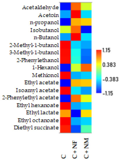Heatmap based on all the volatile compounds detected in the experimental wines obtained by the mixed starters with S. cerevisiae EC1118 (C) and H. osmophila ND1 in two different formulations (NF—free cells; NM—microencapsulated cells) in comparison to the single starter wine with EC1118 (C). Colors represent the range of Z-scores (calculated over the rows), with blue indicating lower than average production, light green indicating average production and red indicating higher than average production of each compound.