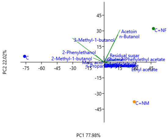 Principal component analysis (PCA) was applied to all the parameters determined in the experimental wines obtained by the mixed starters with S. cerevisiae EC1118 and H. osmophila (ND1) as free (NF) and microencapsulated (NM) cells in comparison with the single starter EC1118 (C). The first principal component (PC1) explained 77.98% of data variability and it was mainly correlated with acetaldehyde, ethyl acetate and 2-phenylethyl acetate, while acetoin, n-butanol, 3-methyl-1-butanol, 2-phenylethanol and ethyl hexanoate contributed more strongly to the second principal component (PC2), which explained 22.02% of data variability. The scatter plot of the three wines on the plane defined by these first two components is shown in Figure 5. The PCA showed that the wines were located in three different quadrants in function of the starter formulation. In fact, the wines from mixed starters obtained by ND1 in the two different formulations (free (NF) and microencapsulated cells (NM)) were located far from each other and also in different quadrants in comparison to the monoculture wine (C).