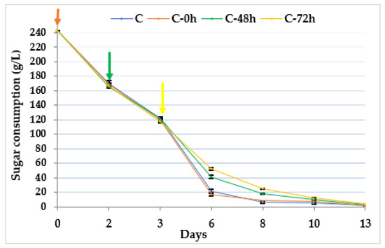 Kinetics of sugar consumption in single starter fermentation with EC1118 strain in grape must added with acetic acid at different times. C—control fermentation, without acetic acid addition; C-0 h—addition at the beginning of the fermentation process; C-48 h—addition 48 h after inoculum and C-72 h—addition 72 h after inoculum. The time of acetic acid addition is shown by the arrow in the graph. Data are expressed as mean value ± SD of three independent experiments.