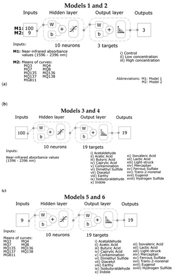 Diagrams of the two-layer feedforward models with a tan-sigmoid function in the hidden layer and a Softmax function in the output layer for (a) Models 1 (Near-infrared inputs), and 2 (electronic nose inputs), (b) Models 3 (low concentration) and 4 (high concentration), and (c) Models 5 (low concentration) and 6 (high concentration). Abbreviations: W: weights; b: bias.