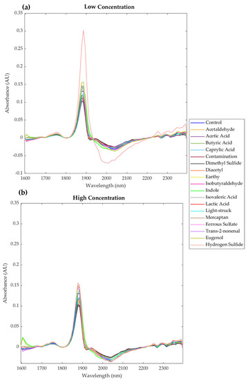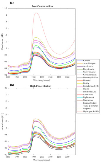 The NIR range used in this study includes the aromatic overtones, which corresponded to 1596–2396 nm. This NIR range has been used in previous studies to characterize and model different volatile aromatic compounds in beers [19,25,32] and wine [33,34]. The major raw NIR peaks shown for all samples were in 1900–2000 nm and >2300 nm (Figure 2), which correspond to overtones of compounds such as carboxylic acid, pOH, water, amides, alcohol, proteins, and carbohydrates [35]. After a first derivative transformation (Figure 3), several other peaks and valleys were enhanced, such as other water overtones, thiols, and starch, all of which are found in beer [35]. The major differences in the latter case were observed between 1600 and 1700 nm, where aromatic compounds and alkyls can be found, at 1890 nm as the major peak, which corresponds to carboxylic acid, which may be present in beer samples in the form of different compounds such as acetic and lactic acids, and may derivate into esters, which are responsible for different aromas in beer [29,35], and between 1950 and 2150 nm, where proteins, amides, alcohol, and sucrose are found [35,36]. Interestingly, one off-aroma addition was significantly different compared to the rest (hydrogen sulfide) for low concentrations (Figure 3a) but not for high concentrations used (Figure 3b). The latter effect may be related to the initial interaction between the H2S compound and other minerals in the beer, increasing the chemical fingerprint in the specific overtones, which decrease at higher H2S concentrations [37]. These patterns and differences between the chemical fingerprint for samples with different fault additions are assessed using machine learning for discrimination purposes and potential identification and classification using ANN modeling techniques.