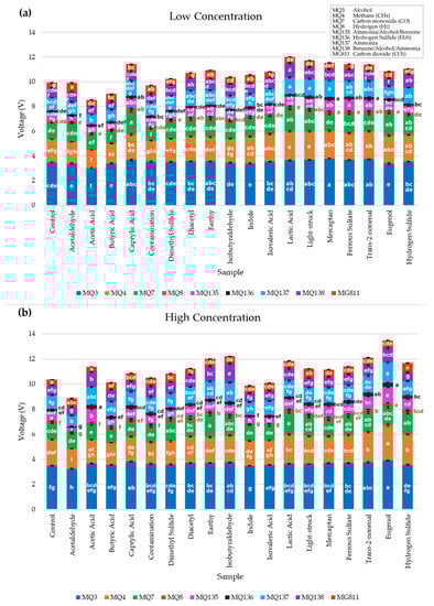 Stacked bar graphs for (a) low and (b) high concentrations showing the mean voltage values obtained from the electronic nose sensors. Error bars are based on standard error. Different letters depict significant differences (p < 0.05) between samples for each sensor based on the Tukey honest significant difference (HSD) post-hoc test.